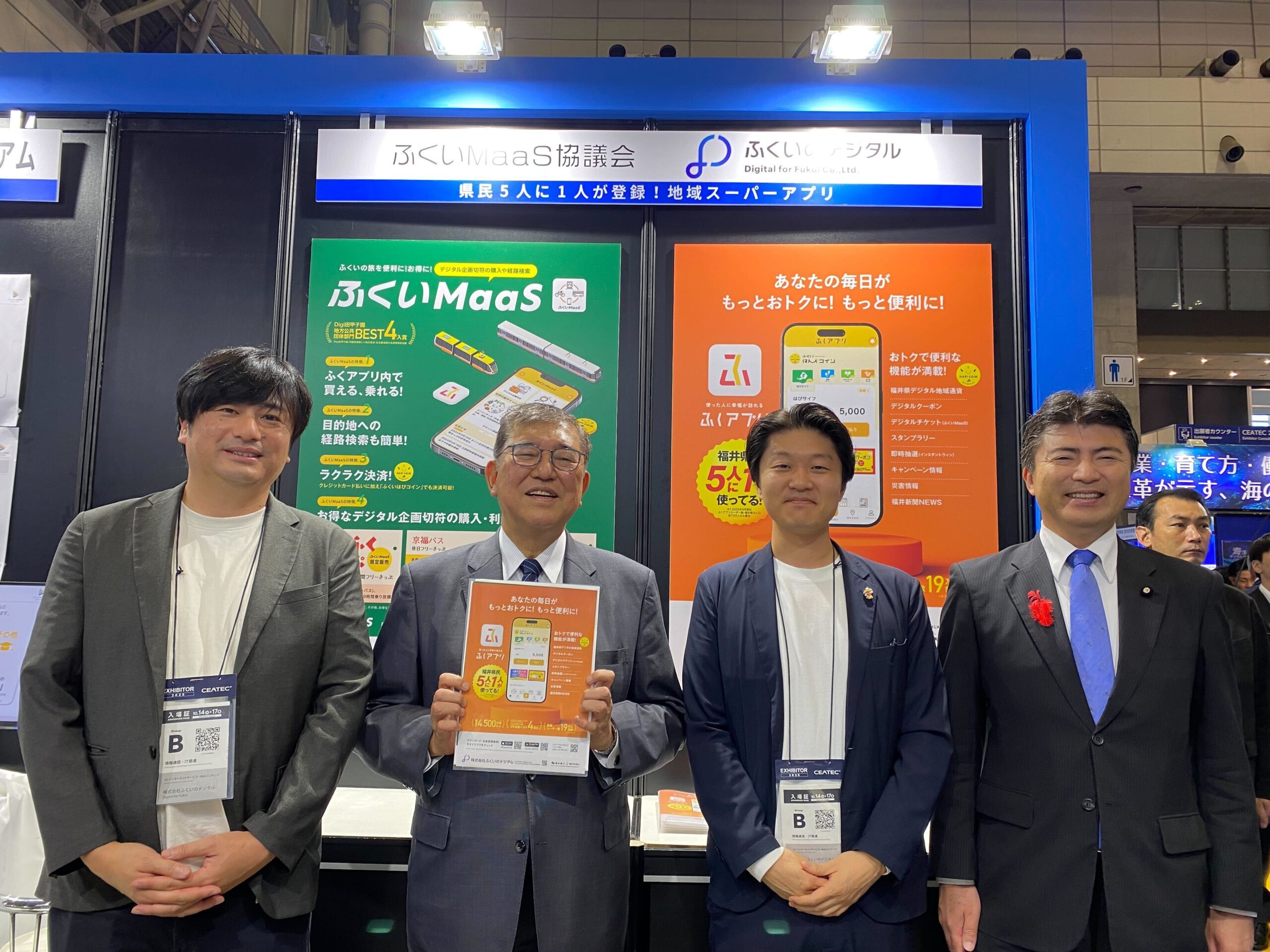 石破総理は同日、CEATECの地方創生2.0パビリオンを、古賀友一郎・経済産業副大臣とともに訪問。当社が共同出展しているブースにもお越しいただき、地銀・地方紙が福井県および県内市町、団体企業と「オール福井」で推進するふくアプリやふくいMaaSの取り組みに耳を傾けていただきました。